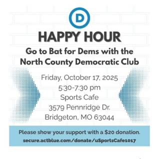 GO to Bat for Dems with our North County Democratic Club, at Sports Cafe, 3579 Pennridge Dr, 63044, Meet & Greet our 2026 candidates and democracy advocates. Suggested donation $20.